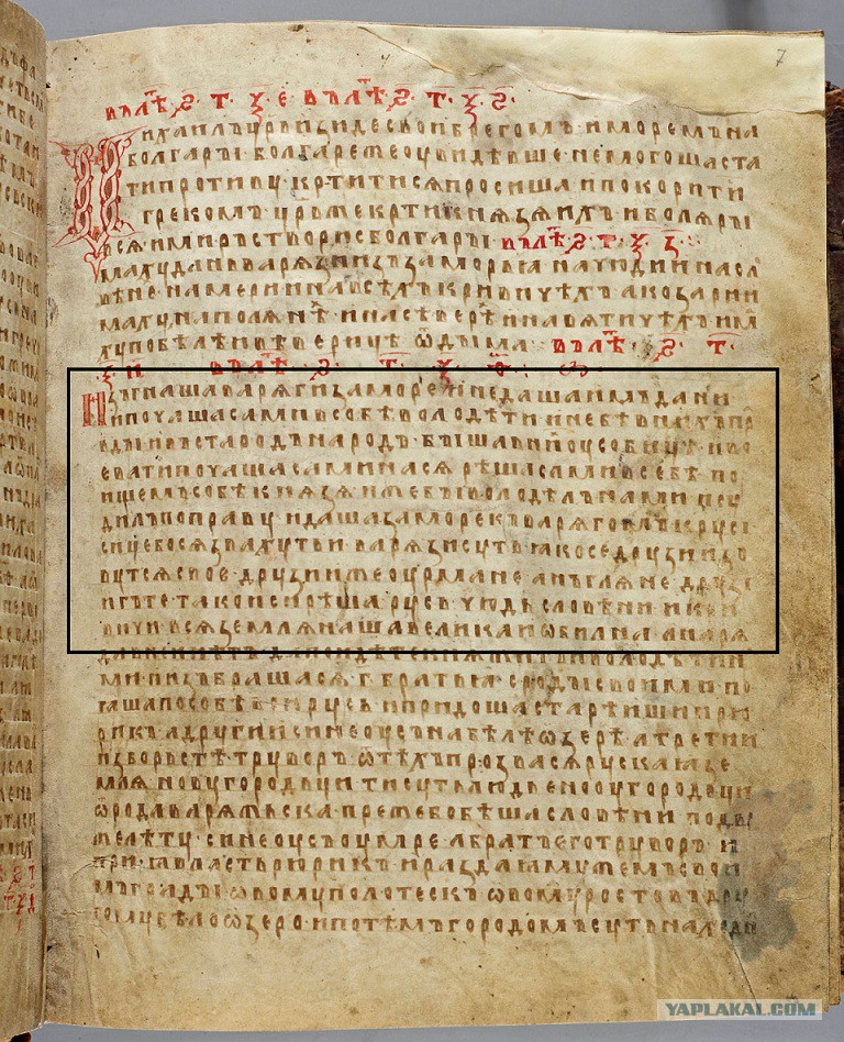 «Обрѣте же ту Еваньгѣлье и Псалтырь, русьскы писмены писано, и чьловека обрѣтъ, глаголюща тою бесѣдою. И бесѣдовавъ с нимь и силу рѣчи приимъ, своеи бесѣдѣ прикладая различно писмена гласьная и съгласная. И къ Богу молитву держа, въскорѣ начатъ чисти и сказати. И мнозѣ ся ему дивляху, Бога хваляще.»