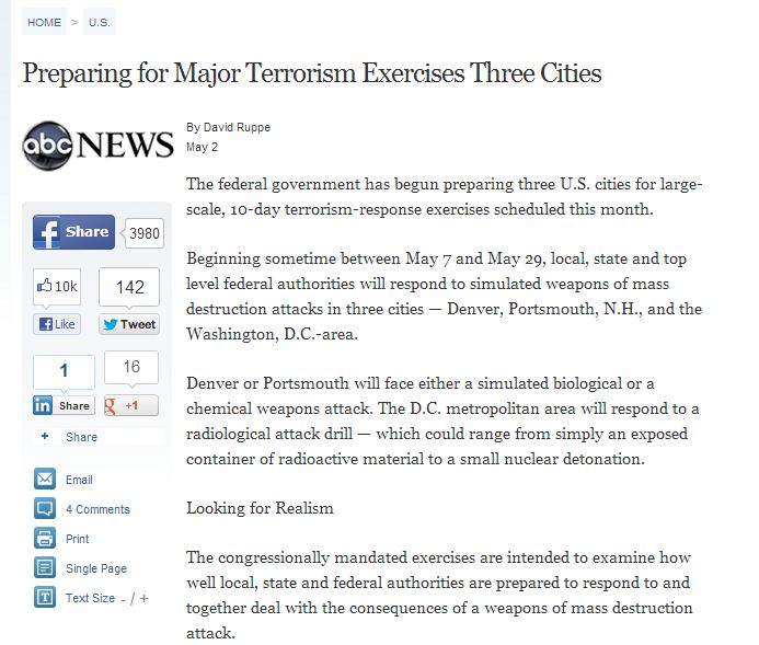 Передает Эй Би Си Ньюс: в трех указанных ниже городах будут проводится полномасштабные учения по реакции на глобальные террористические акты-химическое и радиационное заражение,применение билогического оружия и т.д .Учения намечены на май месяц.