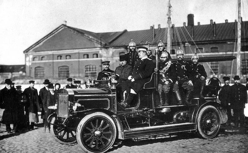 Один из первых механизированных выездов пожарных на автомобиле "Коммер-Кар".