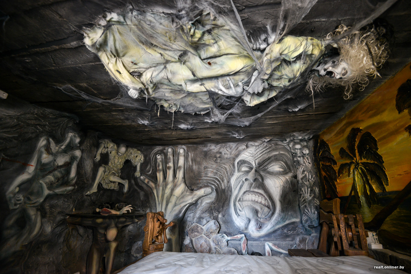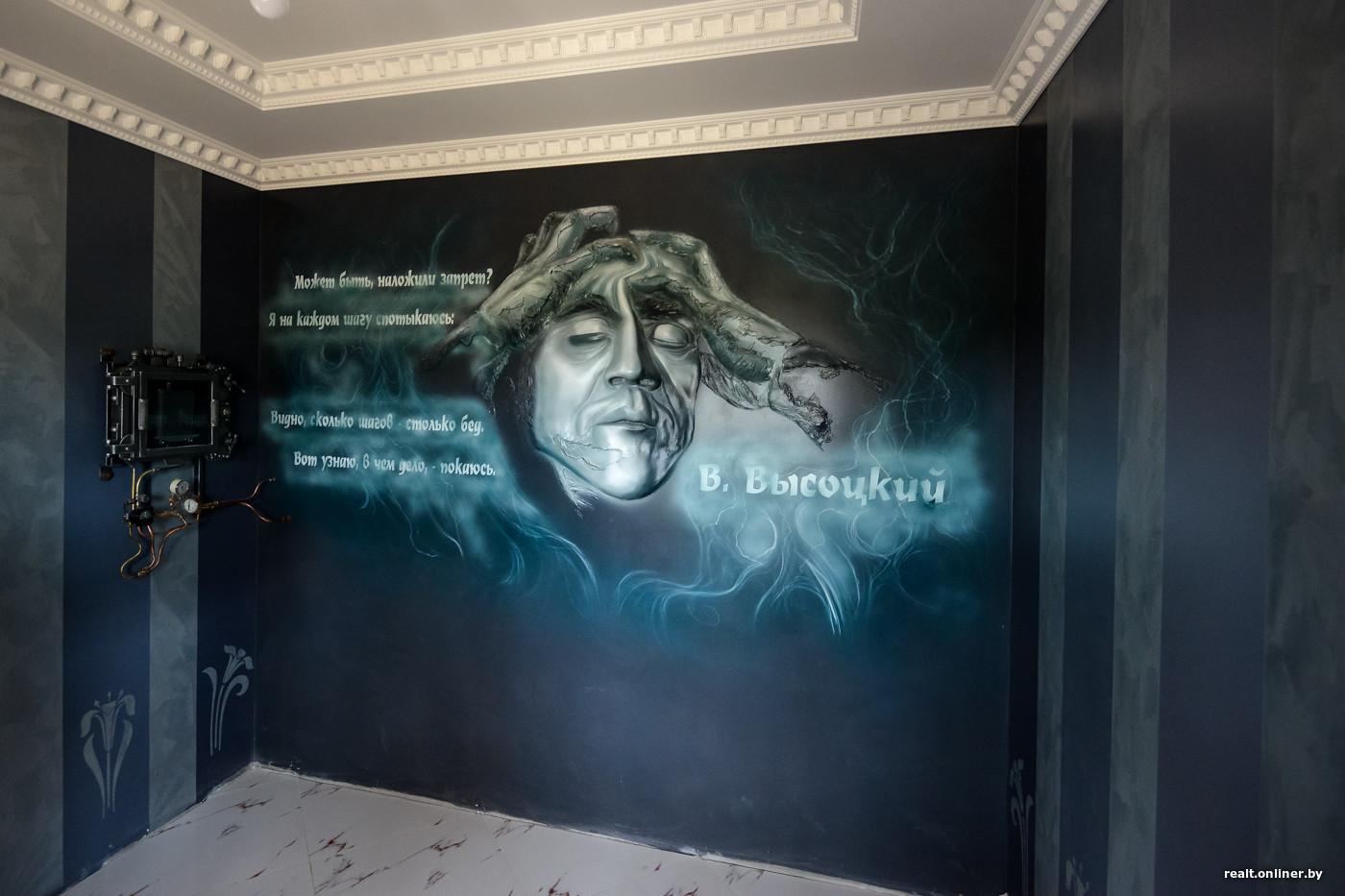 На заднем дворе красуется скульптура, показывающая, как жаба душит творческого человека, держащего в руке Землю.