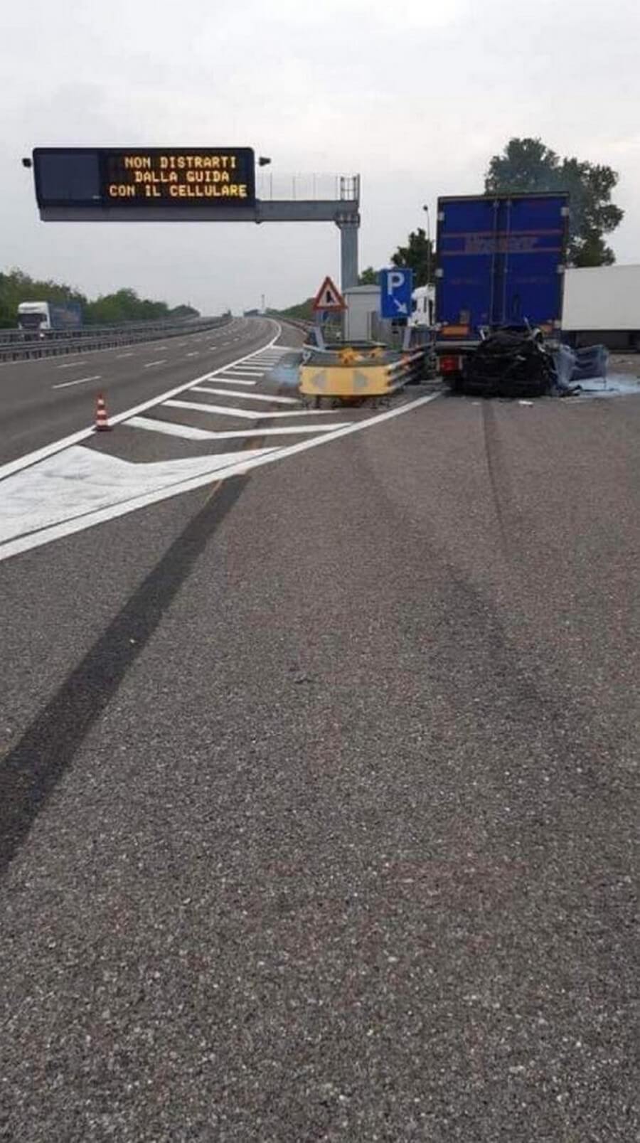 Audi A7 на большой скорости въехал за грузовиком. Автомобиль просто застрял под полуприцепом и загорелся. Трагедия произошла на автостраде A7 в направлении Милана.