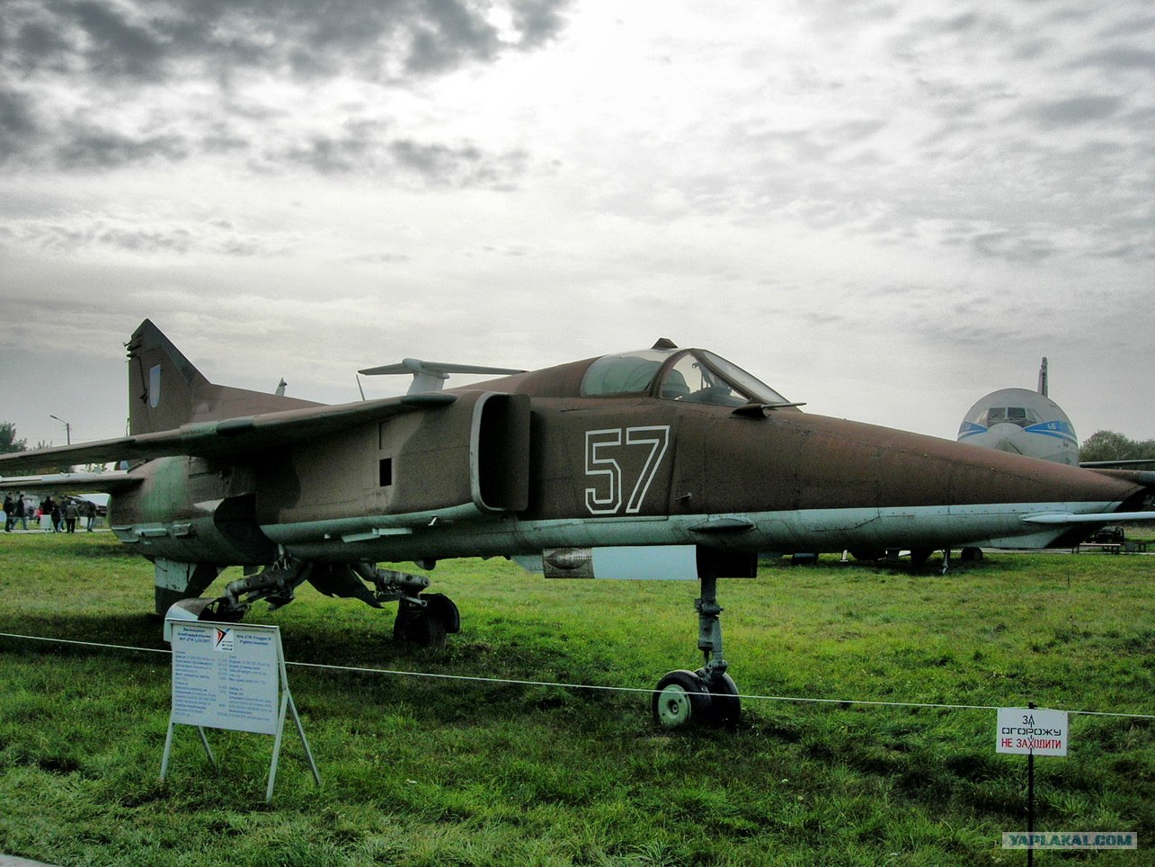 56. МиГ-23 - машина третьего поколения и один из первых советских боевых самолетов с крылом сменной геометрии. Такое крыло улучшало летные и тактические свойства, поскольку давало возможность соединить высокую скорость с большой дальностью полета, маневренностью и хорошими взлетно-посадочными характеристиками. В коллекции представлены три машины из довольно большого „семейства” - фронтовой истребитель МиГ-23МЛ, и два созданных на его базе истребителя-бомбардировщика - МиГ-23БМ и МиГ-27К. Последний получил самое сложное в своем классе радиоэлектронное оборудование и широчайший спектр высокоточных вооружений.