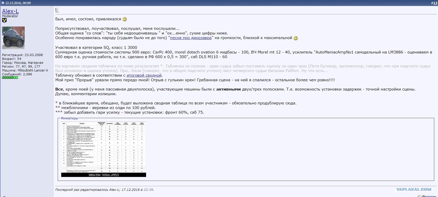 Кстати, был с этим инсталом на соревнованиях по автозвуку (HQ) в Измайлово, в 2016. Без подготовки. У всех участников процессорные системы - возможность установки задержек и точной настройки сцены; трехполосные поканалки и прочее бла-бла... Один я с asus xonar dx и со своим усилком ) Четвертое место. И то только потому, что третье девушке отдали )