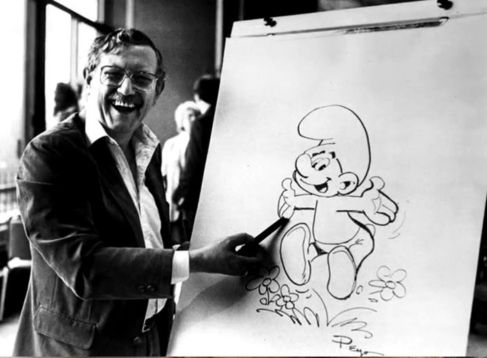 57 Пьер Кюллифорд, создатель смурфиков, представляет свой законченный рисунок смурфа в студии в Брюсселе, Бельгия, 1983 год
