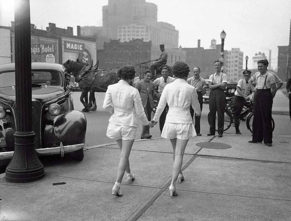 Первые женщины, появившиеся на публике в шортах, вызвали шквал эмоций прохожих, аварии авто, 1937 год. Торонто