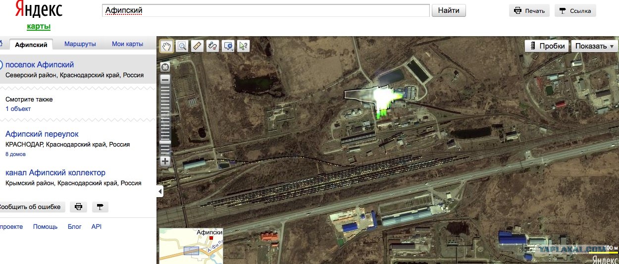 Мой родной поселок Афипский, ума не приложу, почему именно эта территория, относящаяся к нефтезаводу закрашена, хотя сам завод, находящийся южнее через трассу свободен для просмотра. Область закрашена и в яндексе и в гугл мапс.