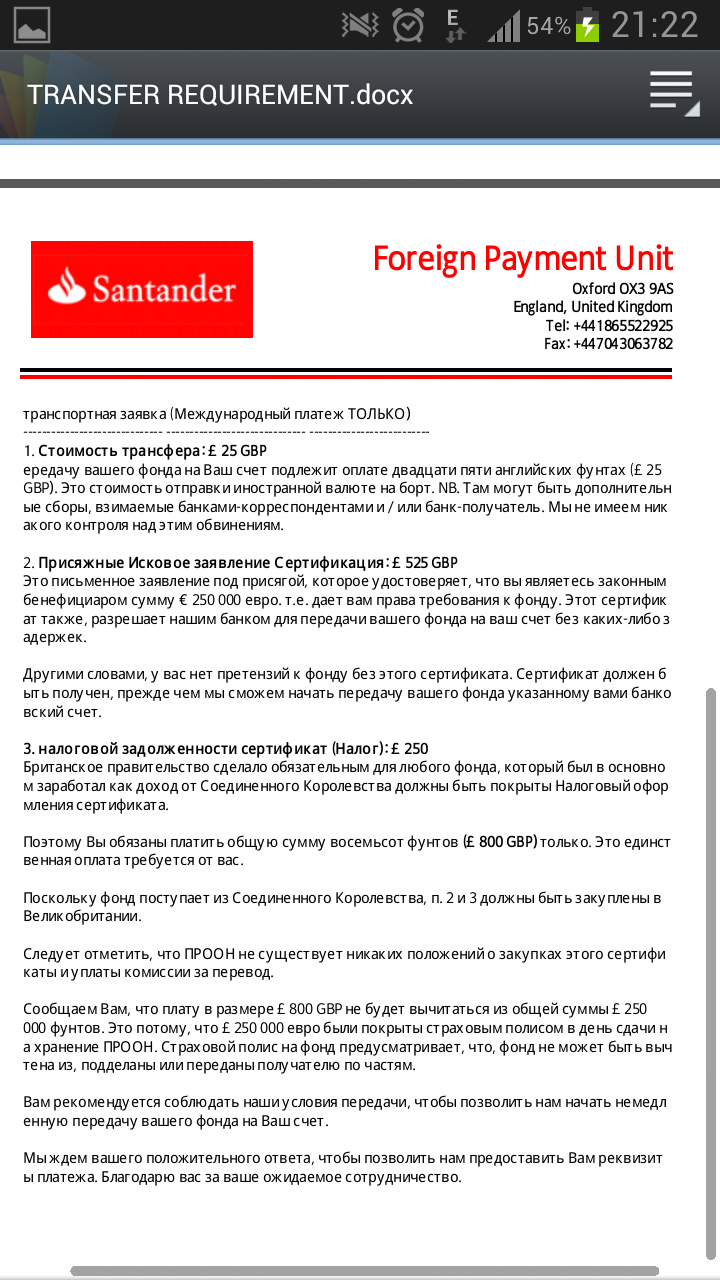 А я, посоны, в настоящий момент тоже переписываюсь с разводилами. Ситуёвина такая: я - счастливчик, который выйграл 250 тыс. евро. Но! Чтоб их получить, мне надо выслать 800 английских денежек. gigi.gif Ща скрин приложу, зацените. Сижу с телефона, так что не серчайте...