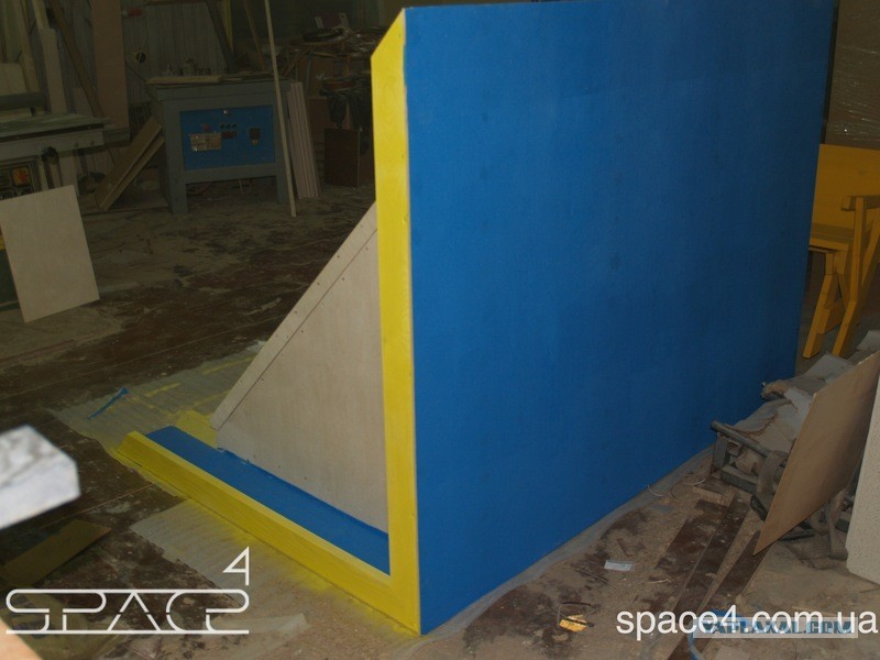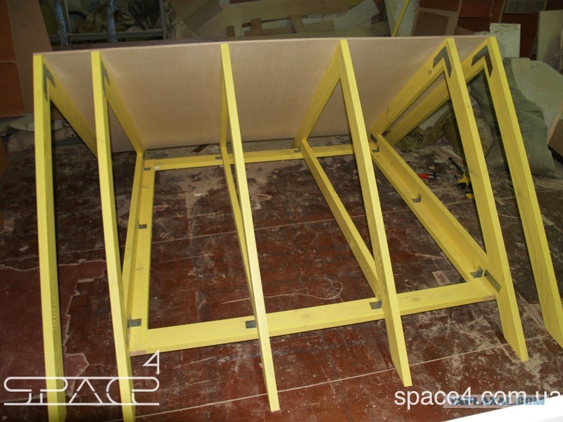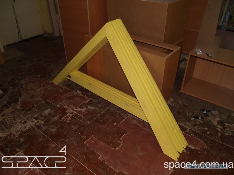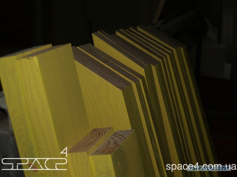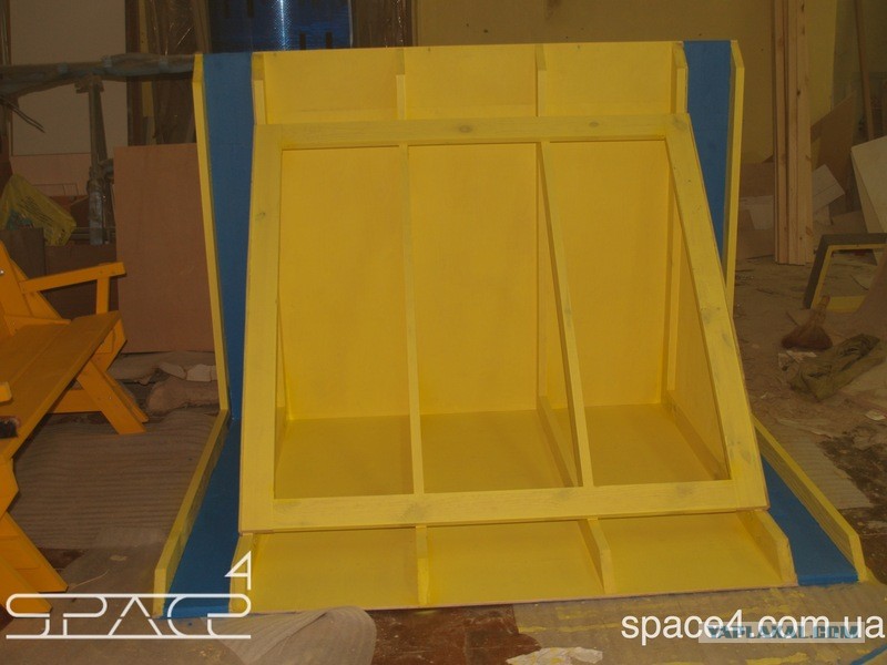 Мы выкрасили стены изнутри в желтый цвет безопасной краской для дерева на водной основе. Это фон будущих репродукций Кандинского.