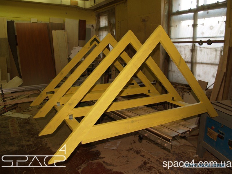 Для стропильной системы мы применили все те же доски 30Х90Х1500. Правда, в этот раз мы их прокрасили перед сборкой. Так удобнее. Для того чтобы углы хорошо совпадали (в нашем случае 45 градусов) желательно запиливать их попарно.