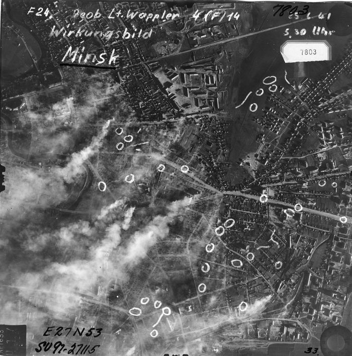 Затем советский герб на здании завесили полотном, а потом заменили новым гербом. Обратите внимание, что флаг SS то развевается на флагштоке, то просто висит поверх старого советского герба. Поговаривают, что его вывешивали к приезду Гиммлера, но все равно непонятно, почему он то на флагштоке, то просто так.