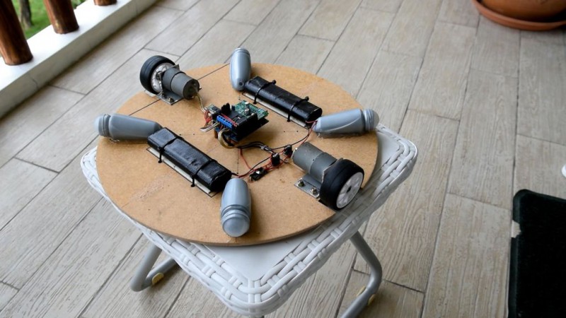 Приложение смартфона отправляет управляющие сигналы по Bluetooth при каждом нажатии кнопки. Модуль Bluetooth принимает сигналы, а микроконтроллер Arduino выполняет их обработку. Далее Arduino подает управляющие сигналы на шилд с двигателями на их включение.