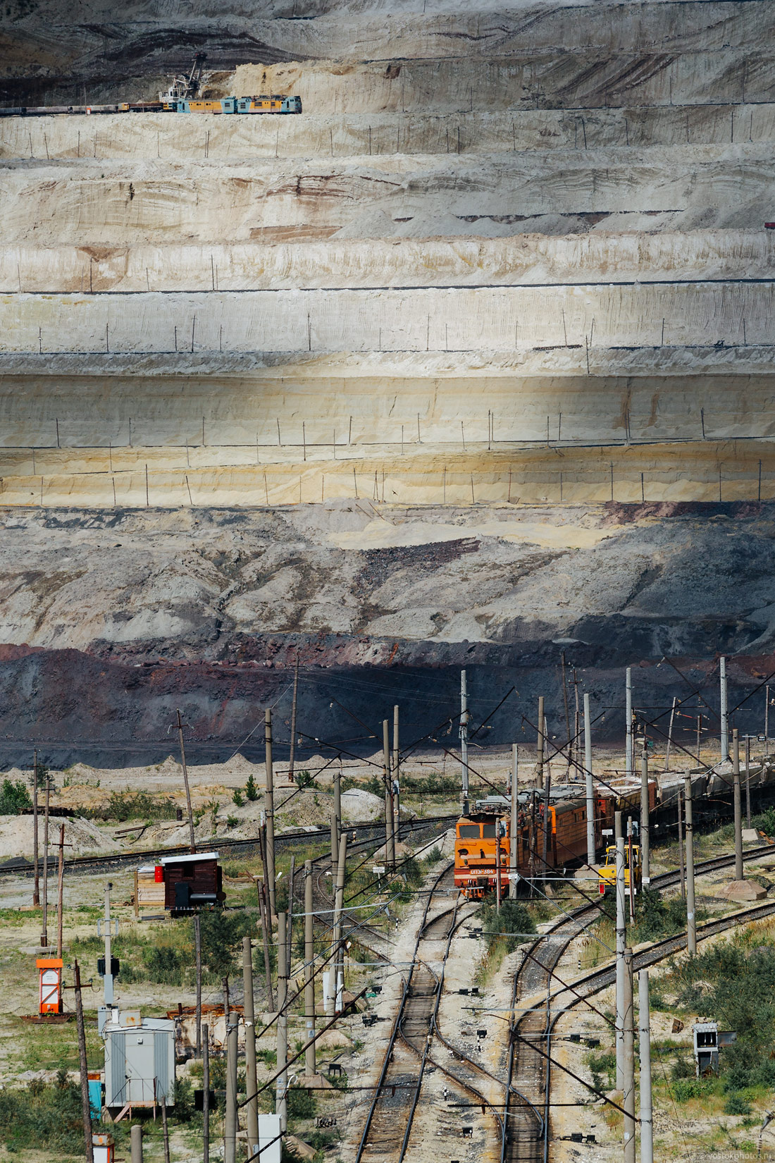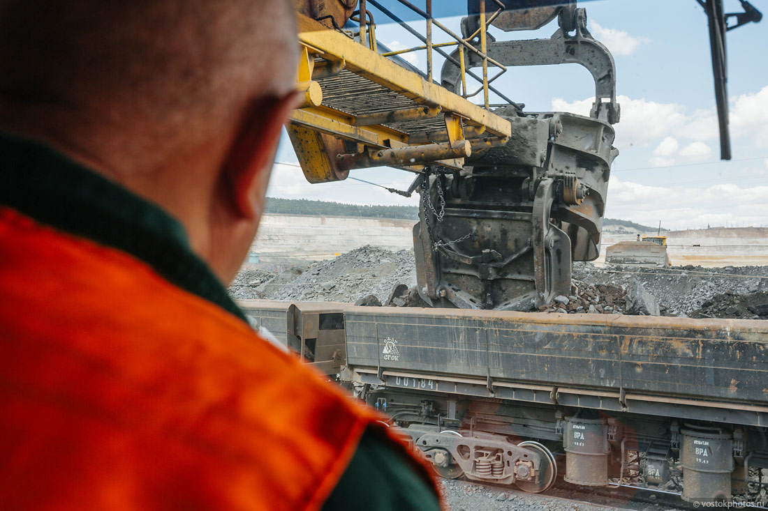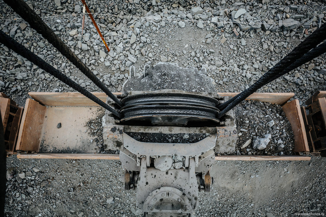 76. Белазы перевозят руду на перегрузочные склады в средней части карьера, где уже другие экскаваторы перегружают её в вагоны думпкары.