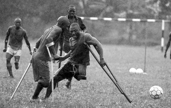 на первом снимке на мой взгляд изображены люди,не сломавшиеся после потери конечностей и продолжающие полноценную жизнь.Мне кажется - это сильно.