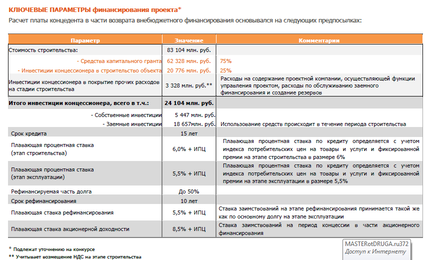 В апреле 2010 года в рамках финансового закрытия по проекту строительства головного участка «Северо-Западной концессионной компанией» был подписан кредитный договор с Внешэкономбанком и Сбербанком России, в соответствии с которым банки предоставят СЗКК для реализации проекта кредит в размере 29,2 млрд рублей на 20 лет. Средства банками будут выделены в равном объёме (по 14,6 млрд рублей каждый). Ещё 23 млрд рублей будет выделено из федерального инвестфонда. Оставшуюся часть финансирования концессионер рассчитывает привлечь за счёт размещения инфраструктурных облигаций[5].