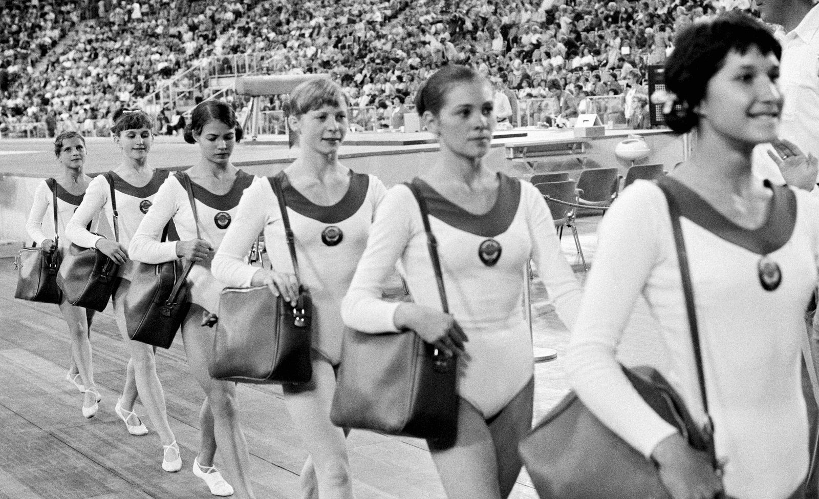 Гимнастки Советского Союза на мюнхенской Олимпиаде справа налево: Эльвира Саади, Любовь Бурда, Тамара Лазакович, Людмила Турищева, Антонина Кошель и Ольга Корбут, 1972 г.