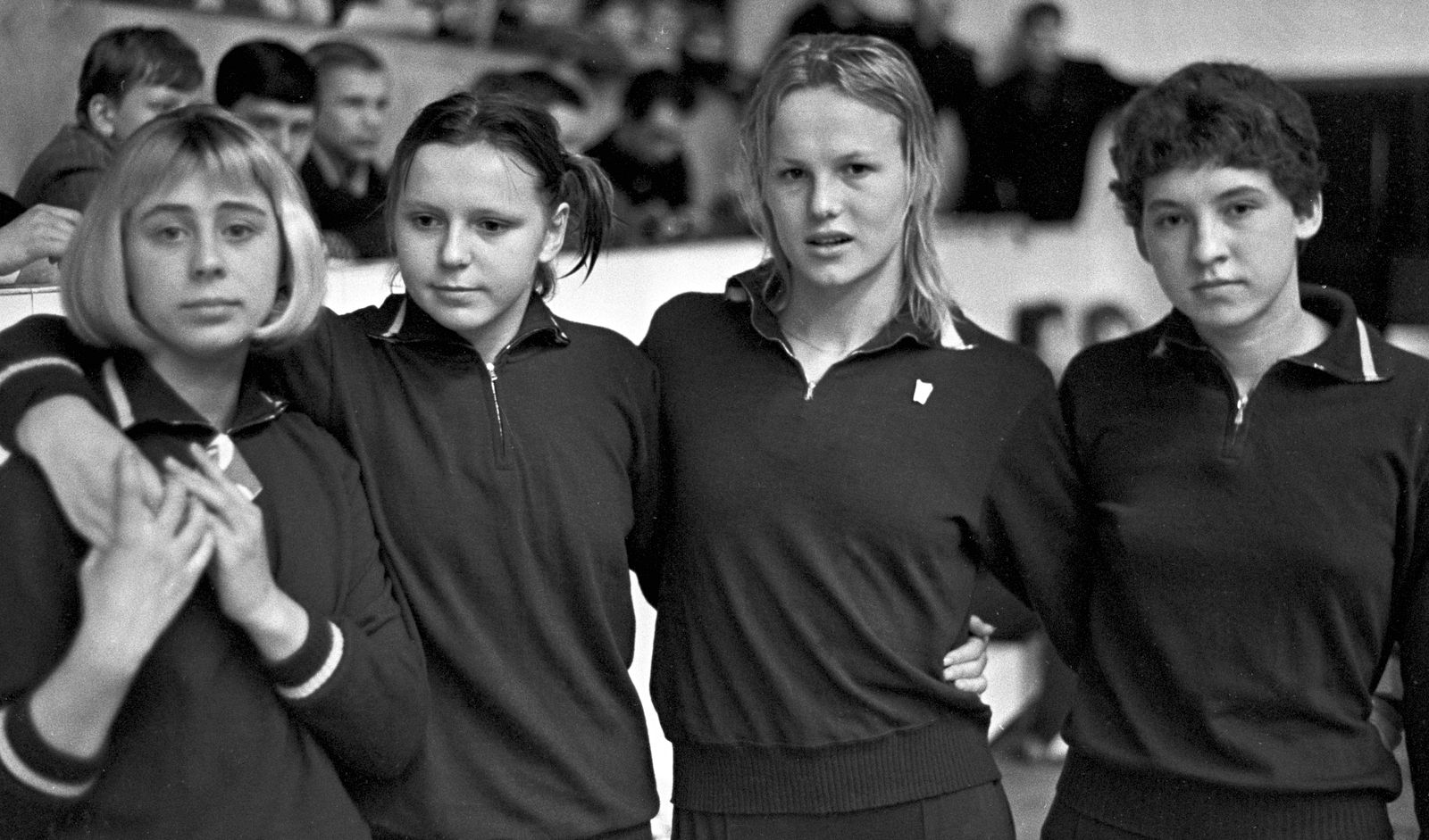 Члены молодежной сборной команды СССР по спортивным танцам на льду: Елена Новикова, Майя Усова, Юлия Романова и Ирина Полунина, 1983 г.