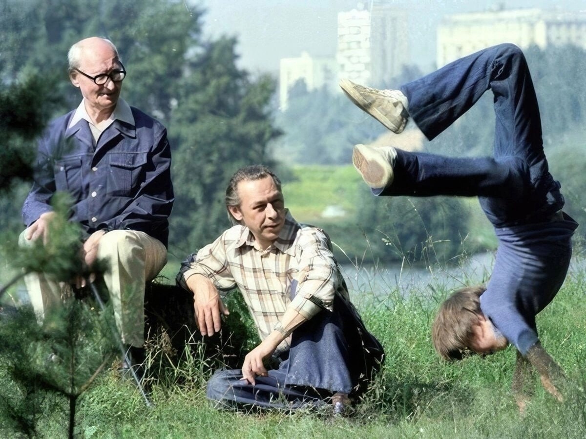 Георгий Вицин и Евгений Моргунов во время гастролей в станице Каневской, 1977 год.