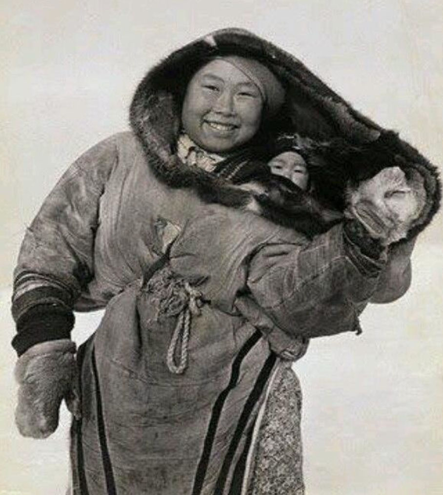 Мать-инуитка защищает своего ребенка от сильного холода.