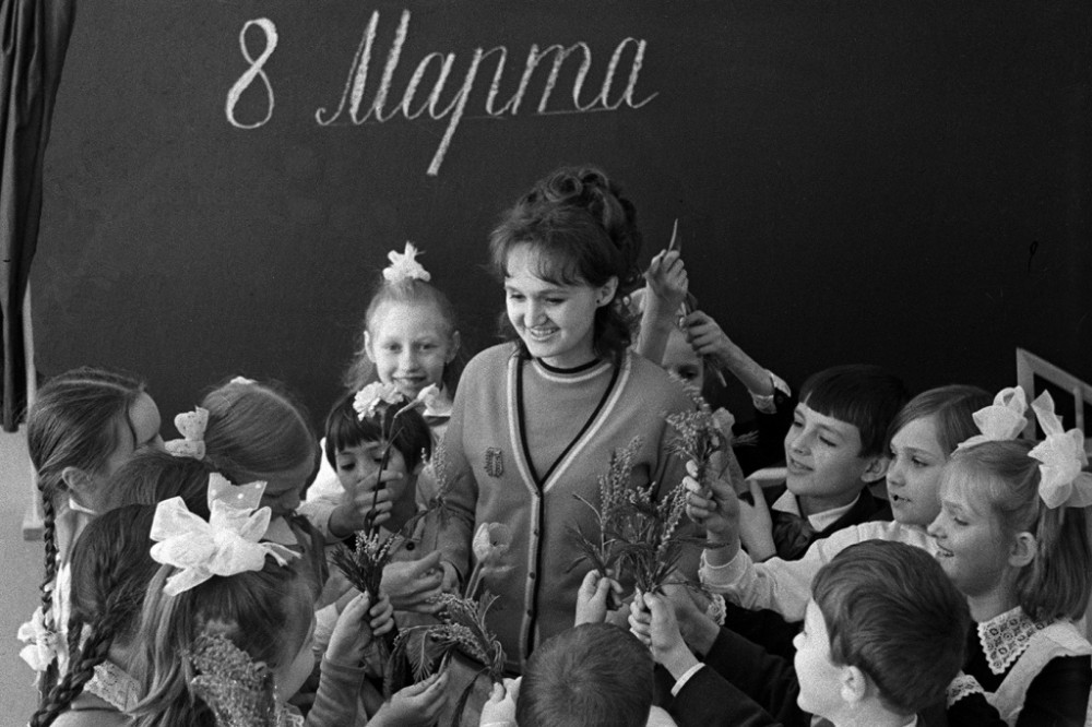 Ученики 3-го класса школы № 813 района Вешняки-Владычино поздравляют свою учительницу В.П. Ефимову с Международным женским днём 8 марта, 1971 год