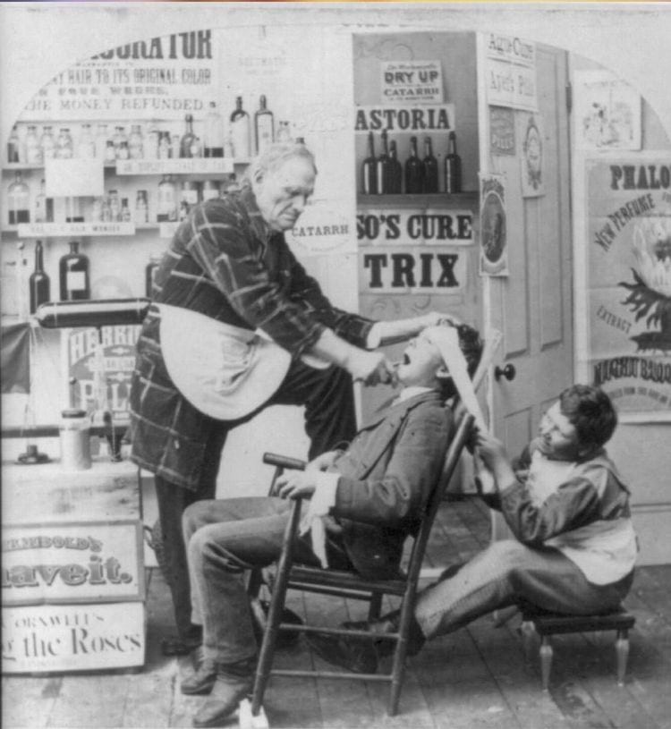 Удаление зуба в винном магазине в 1872 году. Ассистент удерживает голову человека полотенцем, в то время как «дантист» удаляет зуб плоскогубцами
