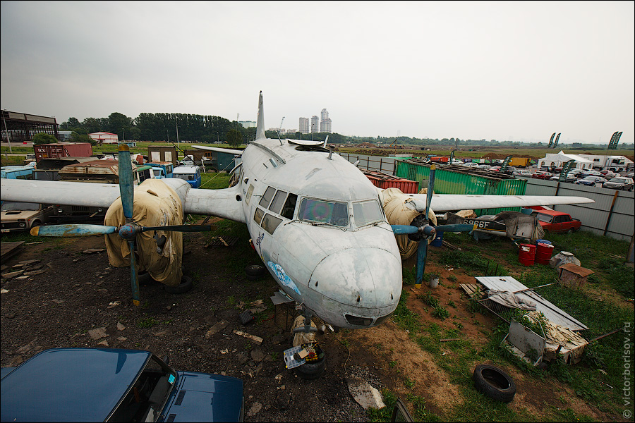 На бывшем Тушинском аэродроме, рядом с Волоколамским шоссе уже давно томятся два одиноких самолета — Ан-26 и Ил-14Т. Казалось бы, их судьба уже предопределена и их в скором времени должны будут распилить. Но в прошлом году из заприметили реставраторы и занялись восстановлением самолета. А в мае этого года russos сделал шикарный репортаж об их работе. В июне мне тоже довелось побывать на Тушинском аэродроме, во время третьего этапа Бойцовского клуба Ягуар и посмотреть на восстанавливаемый самолет.