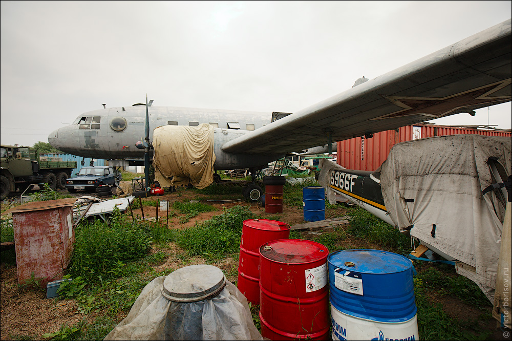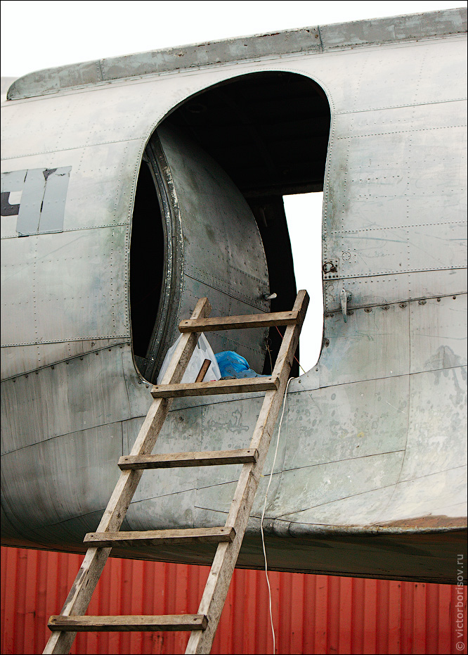 2. Андрей (vulkan_avia): «Сначала он гордо стоял на центральной стоянке рядом с двумя красавцами Ан-26. Потом один Ан-26 распилили на металлолом, а гиганта перекатили сначала в один угол стоянок, потом в другой, а потом и вовсе кинули в траве. Мне его было безумно жалко. Такой большой, красивый, гордый самолёт вдруг стал никому не нужен. Но почему? Почему? Ведь он был прекрасным самолётом, честно служил людям, старался изо всех сил, а тут все про него забыли. На аэродроме проходили праздники, подвыпивший народ лазил по самолёту, ломая закрылки, по которым взбирались на крыло, крутя винт и громя всё оборудование внутри самолёта... Несколько раз я сгонял народ, ломавший самолёт. Меня искренне не понимали - почему я так возмущался, ведь он же ничей, его можно ломать! Но что я мог сделать в тот момент? Хозяина я не знал, как найти - тоже не представлял.... А самолёт погибал. Когда же он оказался на краю аэродрома, брошеный и открытый, я решил: Хватит! Нельзя просто так равнодушно дать ему умереть! Надо сделать всё, что можно, но сохранить этого красавца».