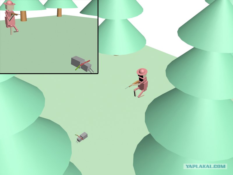 схематический заяц, алчно жующий схематическую морковку - убит в схематическом лесу, схематическим охотником из схематического ружья