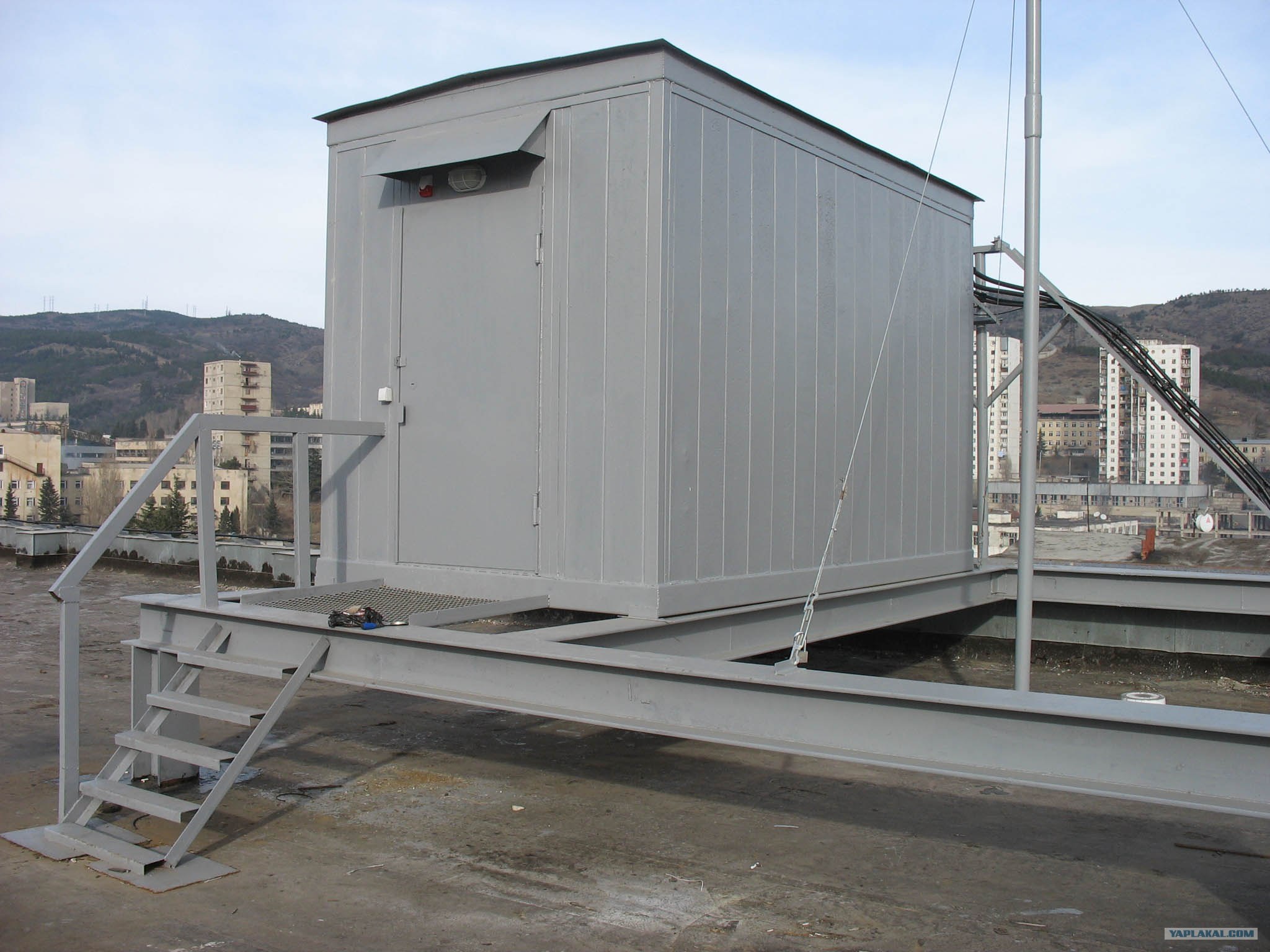 На входной двери, ведущей на крышу, висит такое предупреждение. Действительно, с таким количеством излучающих устройств, находится на крыше долгое время не очень безопасно.