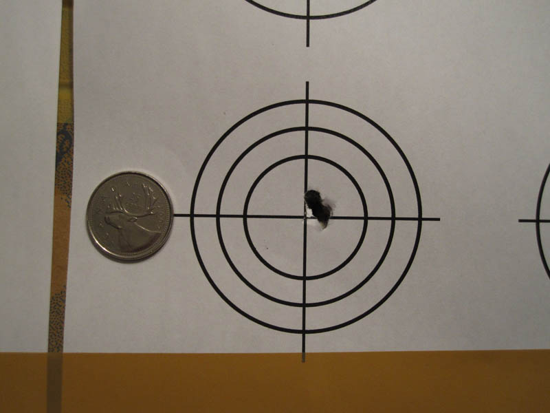 на 10 метрах (туда залетело больше чем 2 пульки как может показаться) smile.gif Монетка - 25 центов.