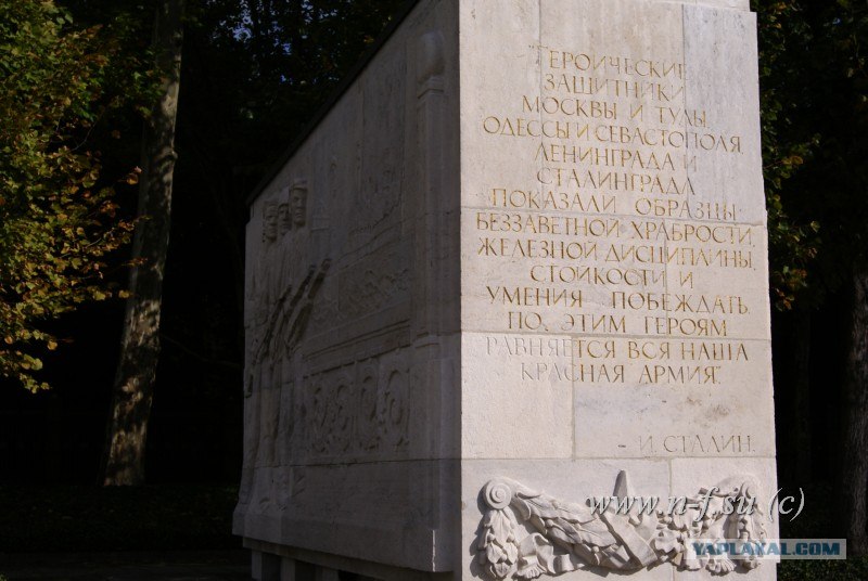 Берлин, Трептов парк, вся площадь парка уставлена монументами с высказываниями Сталина, с одной стороны на русском языке, напротив перевод на немецкий.