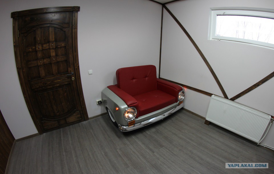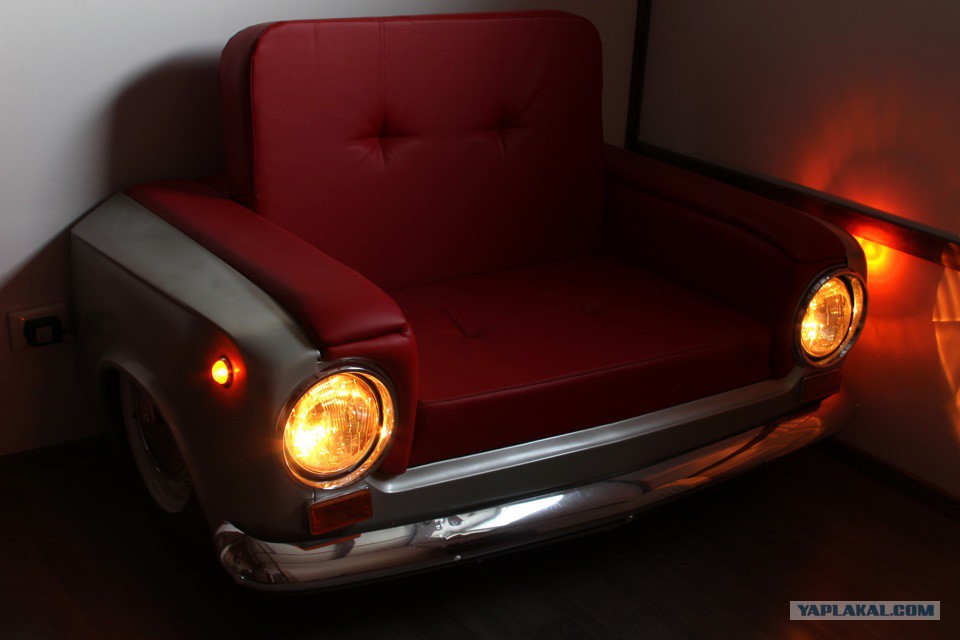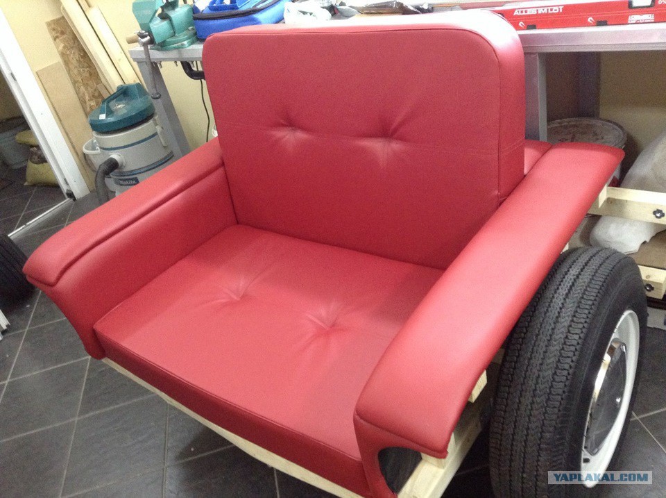 Изготовили подлокотники из фанеры, придали им скругленную форму и пошили все это дело кожей и обратите внимание – фары горят, правда только ближним светом, дальний опционально!)