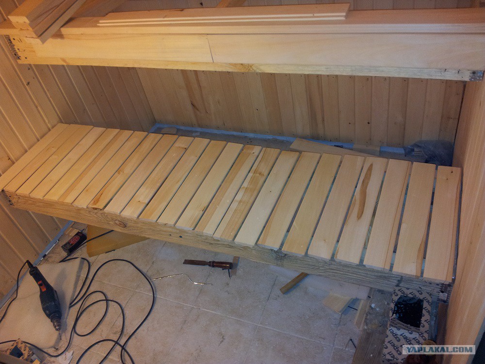 27. из остатков вагонки подгоняю по размерам, спинку на нижнюю полку.