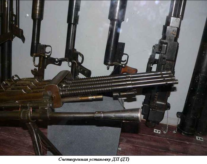 В начале ВОВ в дегтяревском КБ-2 Ковровского завода в опытном порядке создали так называемую «установку шквального огня» – счетверенную установку ДП (ДТ) для вооружения пехоты, кавалерии, бронемашин, легких танков, а также нужд противовоздушной обороны. Пулеметы устанавливались в два ряда или в горизонтальной плоскости и снабжались штатными дисковыми магазинами или коробчатыми на 20 патронов. В «зенитном» и «пехотном» вариантах установку монтировали на универсальном станке Колесникова разработанную для крупнокалиберного ДШК. Темп стрельбы – 2000 выстрелов в минуту. Однако данный путь «борьбы за скорострельность» не оправдал себя, а действие отдачи на установку и рассеивание были слишком велики.