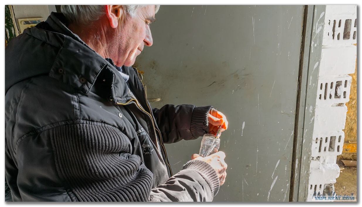 за процессом надо следить, что Тодор и делает на фото с помощью спиртометра - берут только 70-градусный самогон, остатки (обрат) заливают во вторую партию: