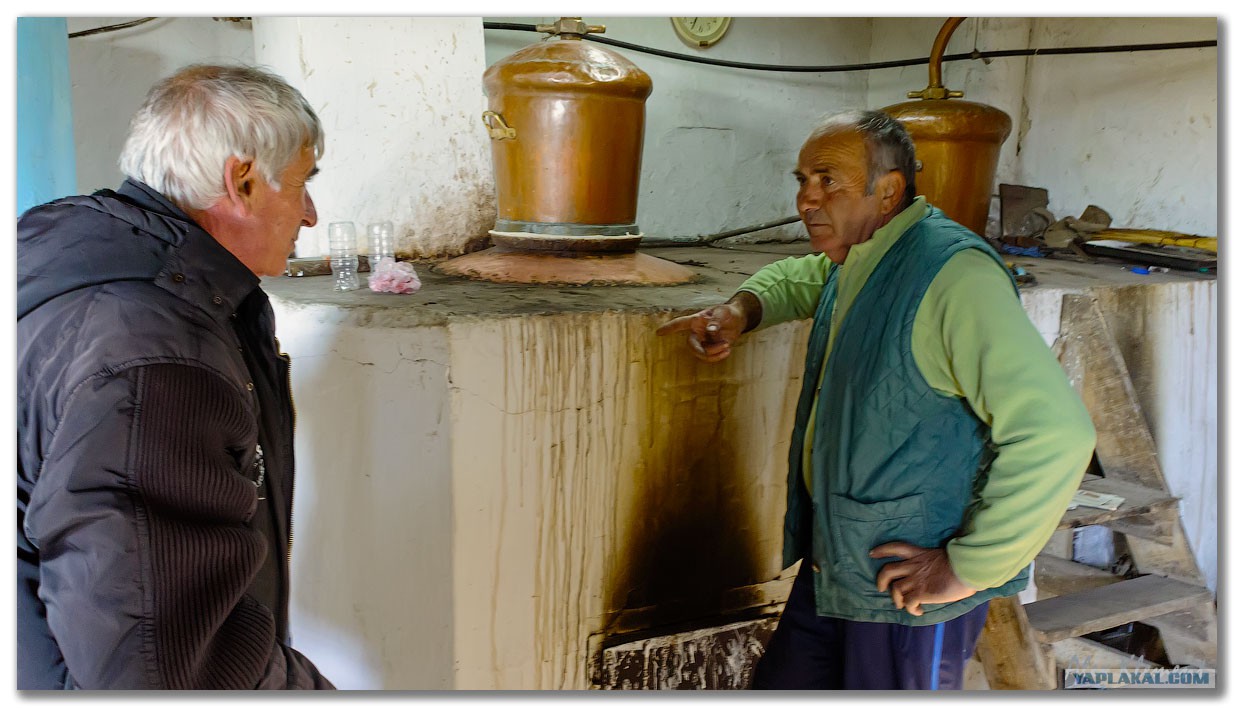 в нашей винарне оказалось два казАна, каждый по 200 литров браги (сусла), котлы вмонтированы в большую дровяную печь, сверху торчат паро-уловители из меди особой формы (видимо отработанной веками), уплотненные в местах стыков с котлами тестом, от них идут медные трубы с клапанами на них к большим охладителям с проточной водой внутри которых находятся медные же змеевики, и все это заканчивается банальной трубой с крантиком из которого и журчит волшебная жидкость...:)