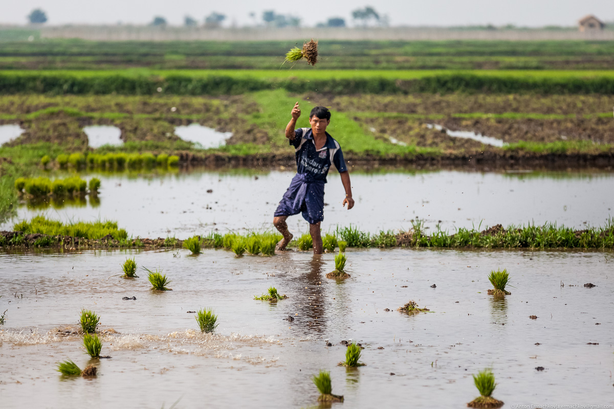 Сначала по полю раскидывают вязанки с ростками риса, после чего девушки выстраиваются в ряд и продвигаясь от одного конца поля к другому очень быстро его засеивают: