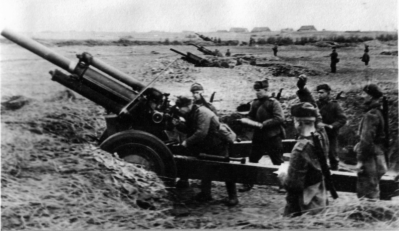 Батарея советских 122-мм гаубиц образца 1938 года (М-30) ведет огонь по Берлину.