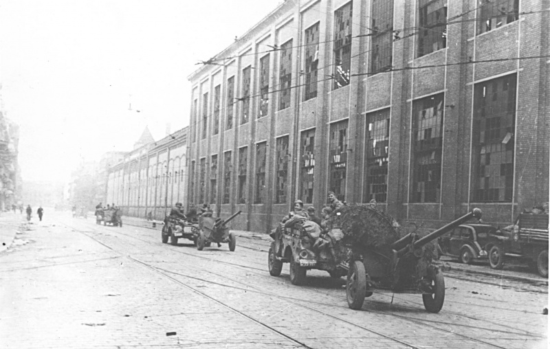 Советские артиллерийские расчеты на автомобилях «Додж» в Берлине.