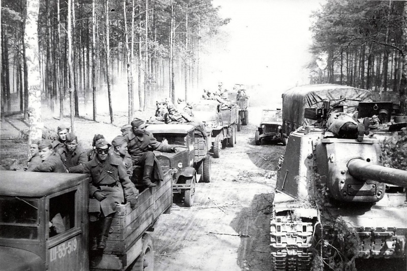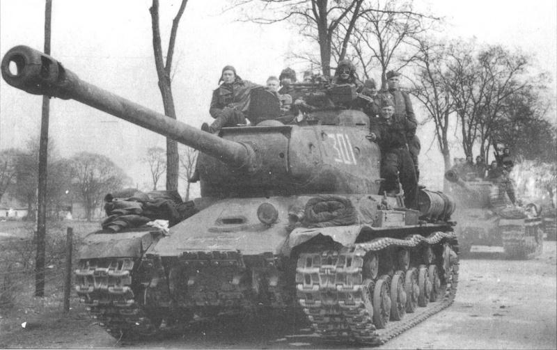 Колонна советских танков ИС-2 на берлинском шоссе.