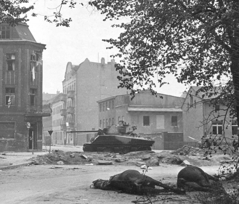 Подбитый советский танк «Шерман» в Берлине. В окнах домов видны белые флаги.