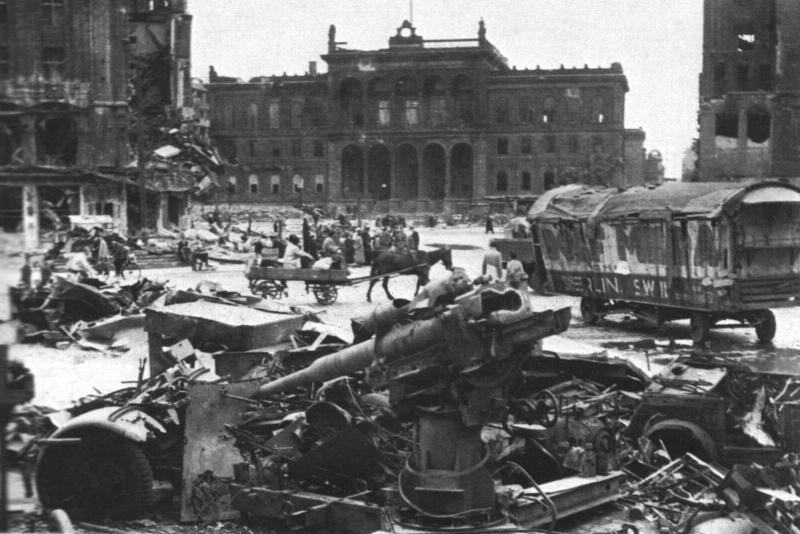 Разбитое немецкое 88-мм орудие ( 8,8-cm зенитная пушка FlaK-18/36/37/41) на улице Берлина.