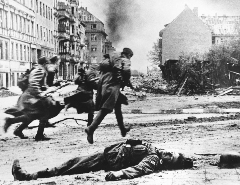 Советские солдаты бегут к новой позиции в бою в Берлине.