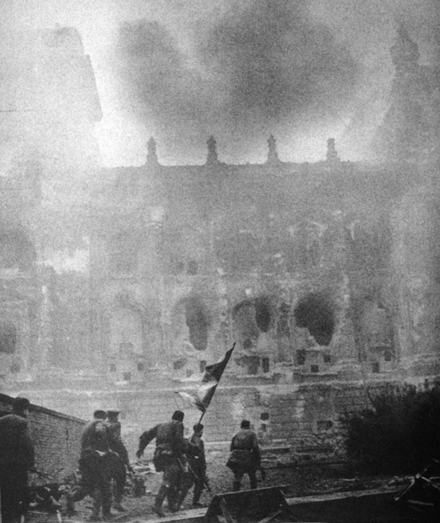 Советская штурмовая группа со знаменем движется к рейхстагу.
