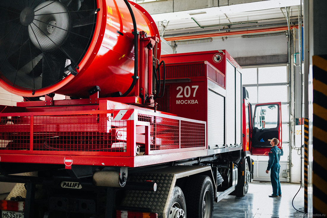 12. Спецтехника АКВ — автоконтейнеровоз. Данный автомобиль имеет три вывозимых модуля: ДУ (большой вентилятор дымоудаления); база газодымозащиты и контейнер для тушения небоскребов, который использовался для ликвидации пожара на башне «Восток» комплекса «Федерация». Внутри такого контейнера прячутся 10 тележек, на каждой из которых расположены мотопомпы, магистральные и рабочие рукава, разветвления и так далее. Смысл в том, что полностью развернутый контейнер обеспечивает подачу воды от головного насоса на расстояние до двух километров по горизонтали или по вертикали до крыши любого небоскреба в Сити.