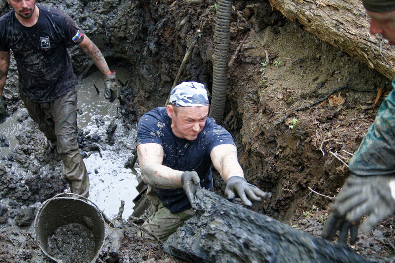 А не поддающаяся насосу жижа - вычерпывается и передается на верх ведрами. Круг раскопа - уже тоже болото.