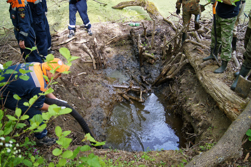Откачка воды из осеннего раскопа, расчистка и расширение воронки