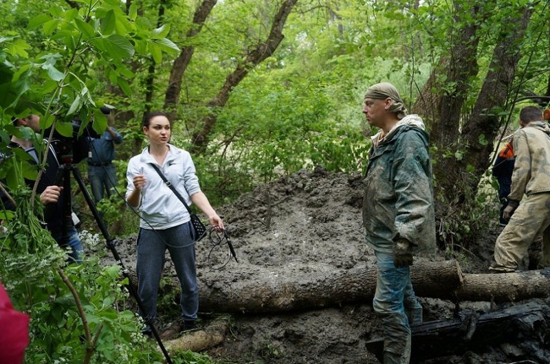Подъехавшее телевидение - в ужасе от кучи грязи, да антуражных поисковиков...