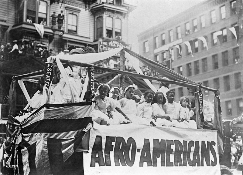 Это "Парад Всех Наций" (часть парада "Золотой Потлач"), на котором были представлены ещё итальянцы, китайцы, индейцы и т.д. Интересное в фотографии то, что уже сто лет назад использовался термин "афро–американцы"...