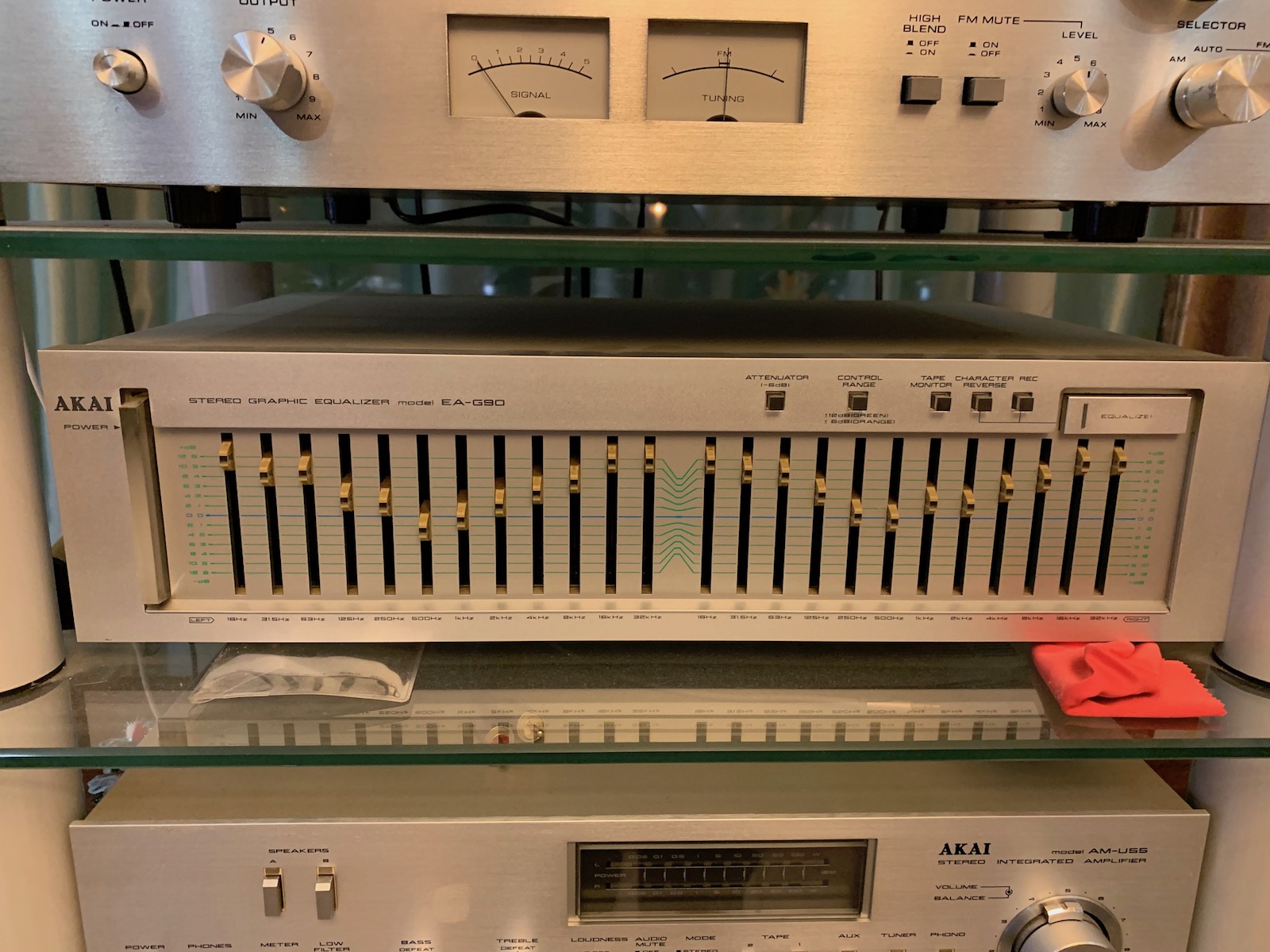 Идем дальше. Эквалайзер AKAI EA-G90. 12-полосный эквалайзер. Взял его только потому, что достаточно редкая модель. Каждая ручка подсвечена зеленым в режиме Control Range, или красным в режиме «Attenuator». В темноте завораживает. Его можно отключить, нажав кнопку «equalizer» справа. Тогда он пропускает сигнал мимо себя. Но иногда люблю ручки покрутить :) Его характеристики: