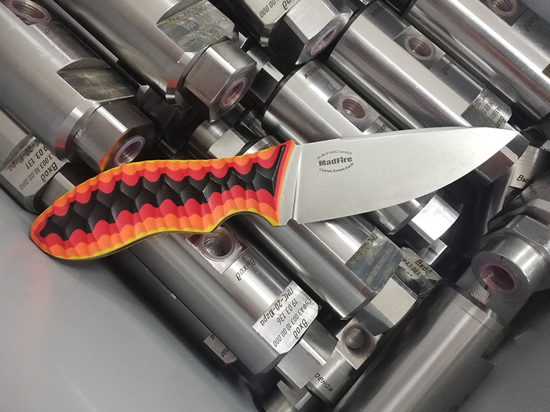 Где огонь? Цвет, фиг с ним, с цветом! Форма рукоятки норм, но вот от этих граней кисть заболит, пока лося очинишь. И носок у клинка не подходит шкуру драть.